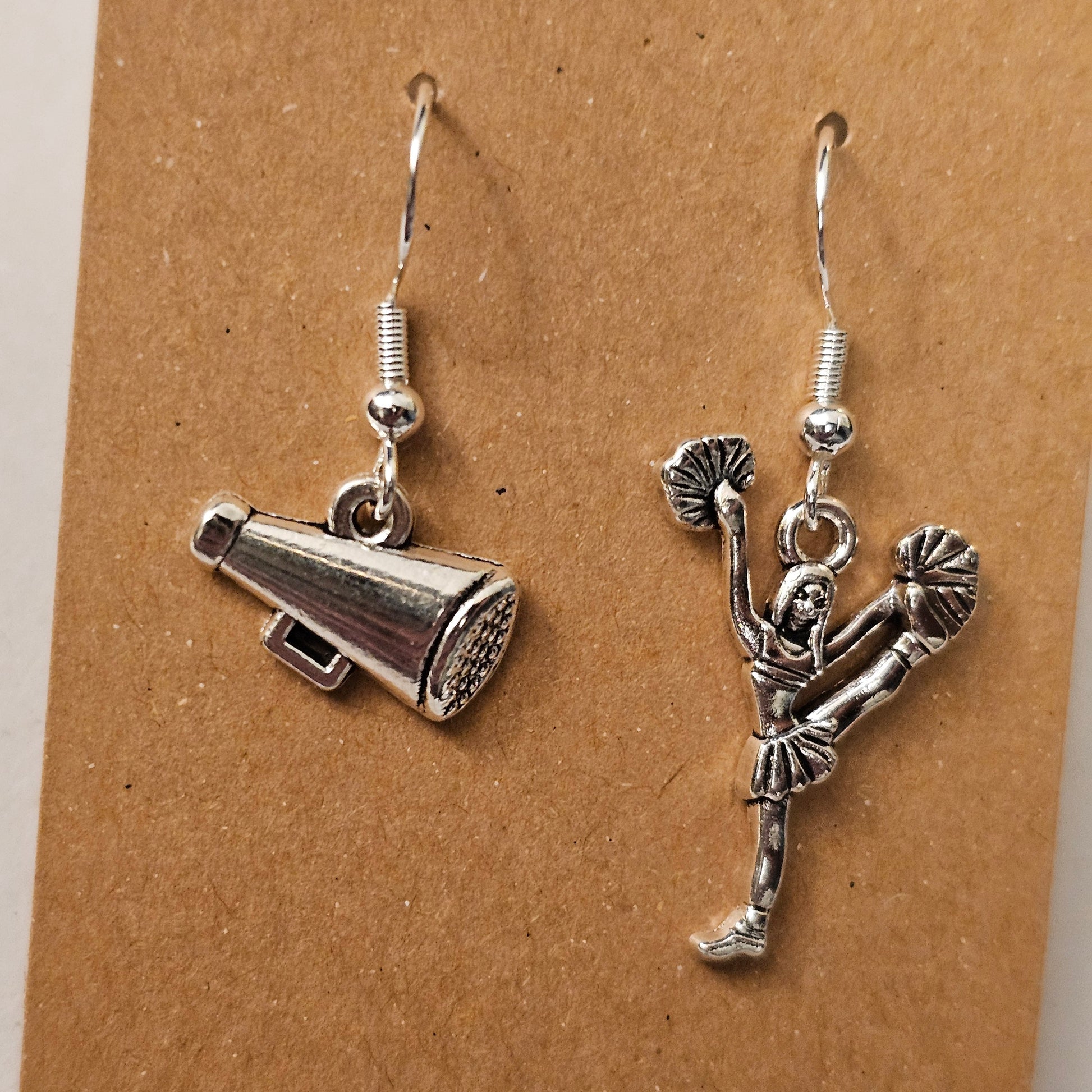 Asymmetrical earrings with Silvery Megaphone and Cheerleader charms to show your team spirit!