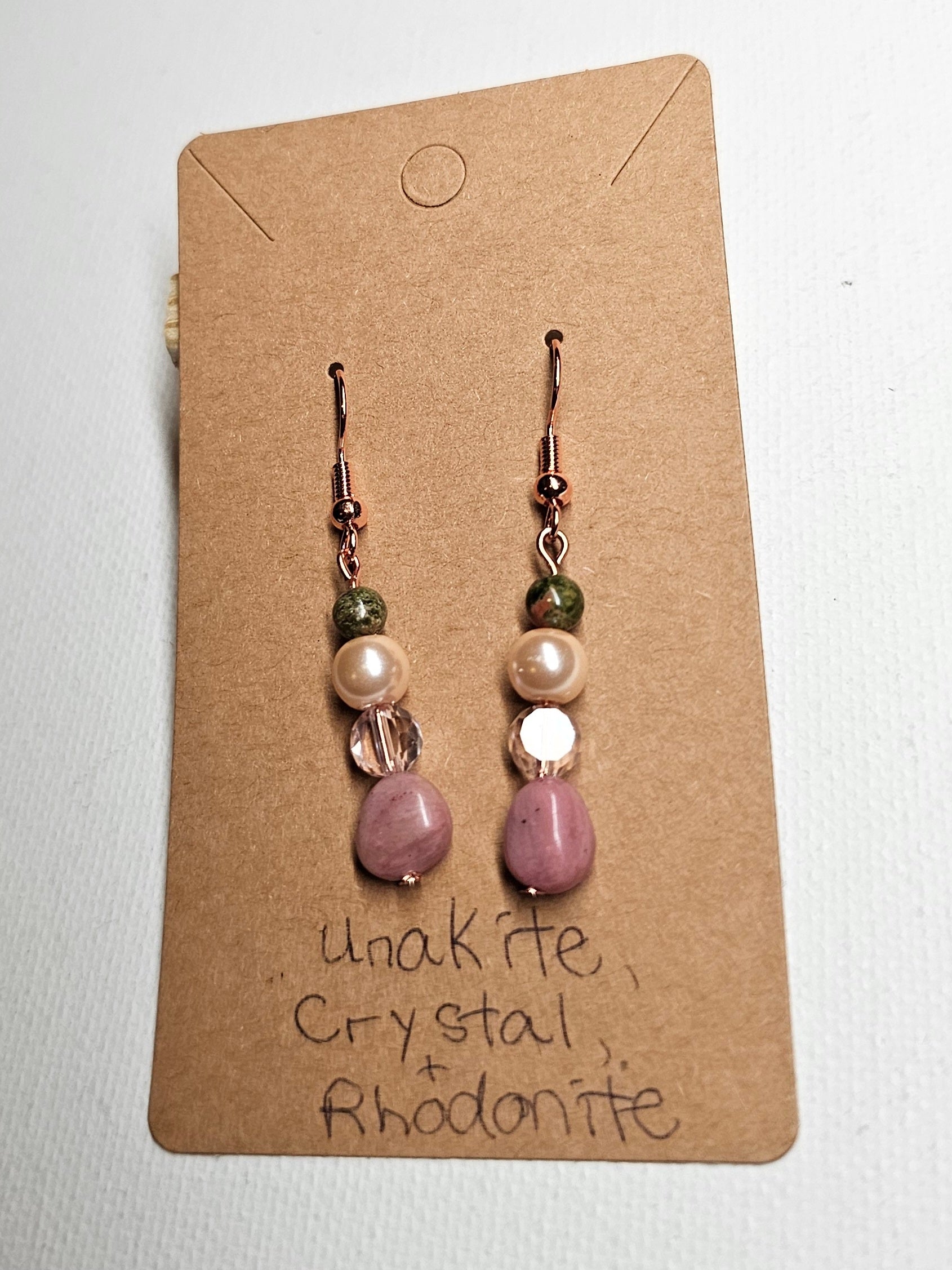 Rhodonite and Unakite, with Crystal and Glass Pearls make up these lovely earrings.